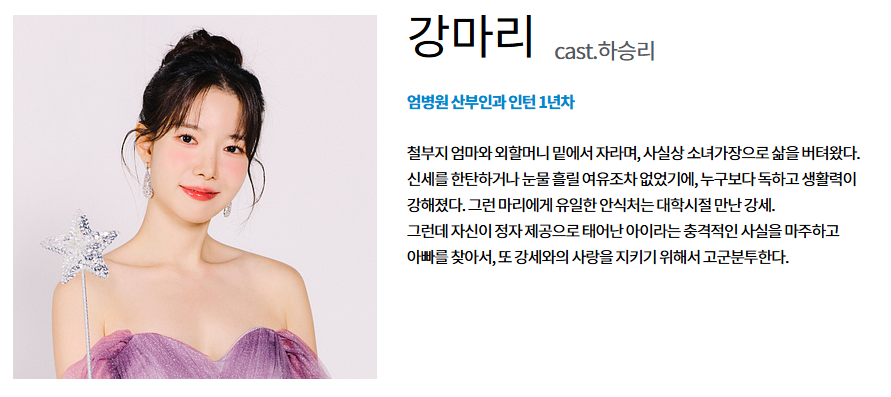 | 하승리 | 강마리 | 소녀가장, 주인공. 세 아빠 후보와 얽히는 인물 |