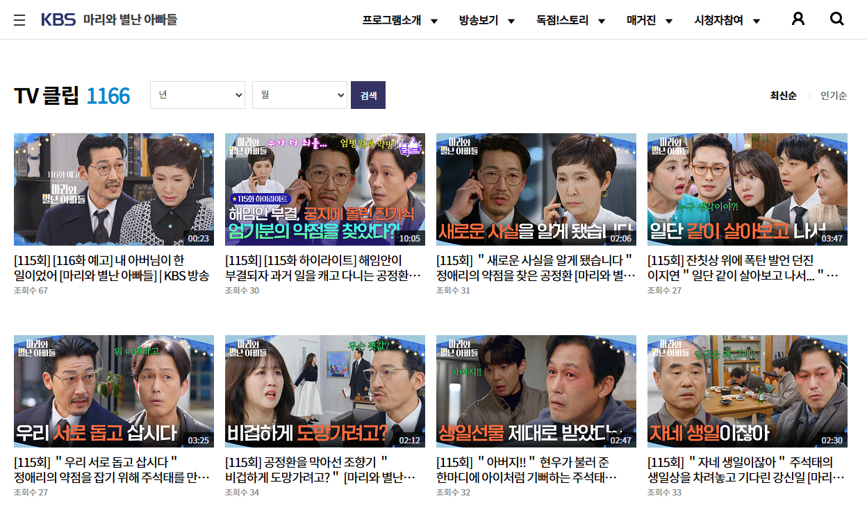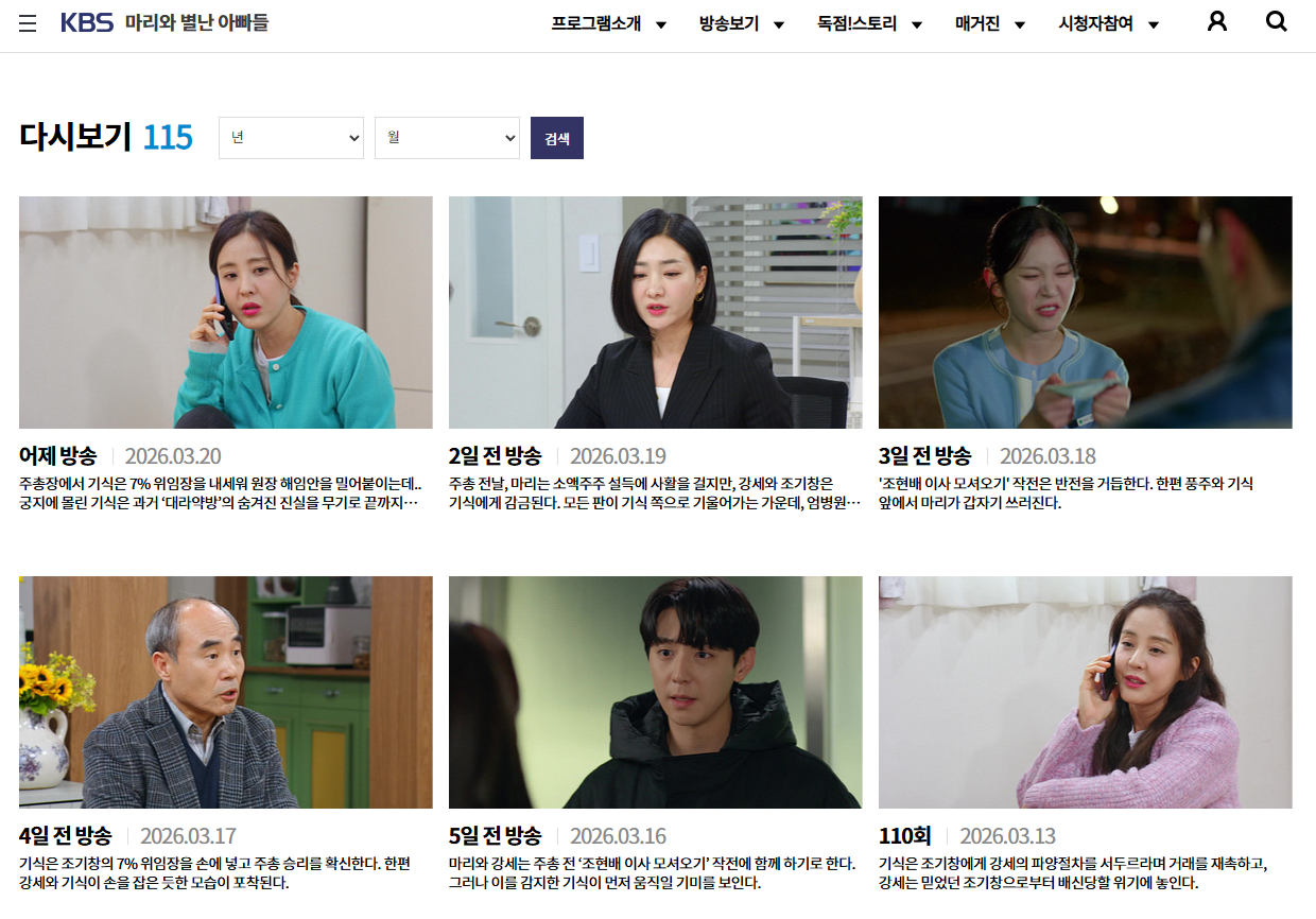 마리와 별난 아빠들은 KBS 공식 VOD 서비스를 통해 무료로 다시보기가 가능합니다. 본방을 놓치셨거나 처음부터 정주행하고 싶으신 분들은 아래 링크를 통해 전 회차를 무료로 시청하실 수 있습니다. PC와 모바일 모두 이용 가능하며, 별도 회원가입 없이도 시청하실 수 있습니다.