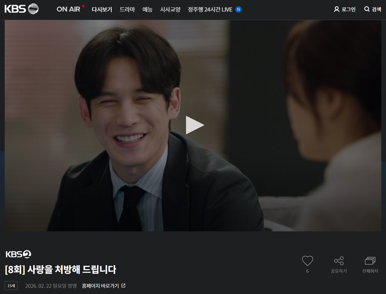 사랑을 처방해 드립니다 다시보기는 OTT 웨이브(Wavve)에서 시청하실 수 있습니다. PC와 모바일 앱 모두 이용 가능하며, 본방을 놓치셨어도 웨이브에서 전 회차를 바로 확인하실 수 있습니다. KBS 공식 홈페이지에서도 다시보기 링크를 제공하고 있으니 아래 버튼을 통해 확인하시기 바랍니다.