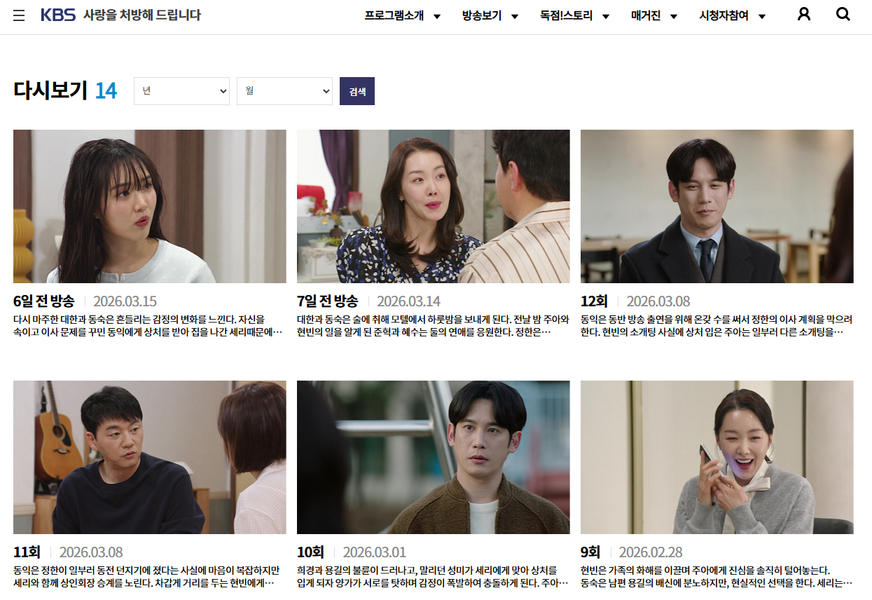 재방송은 KBS 드라마 채널과 KBS W 등 케이블 채널에서 편성되고 있습니다. 재방송 시간은 주차마다 변동될 수 있으므로 KBS 공식 편성표에서 확인하시는 것이 가장 정확합니다. 현재 14회까지 방영 중이며, 총 50부작이기 때문에 지금 시작하셔도 충분히 정주행 가능합니다.