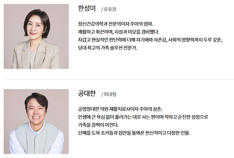 | 유호정 | 한성미 | 공정한의 아내. 공주아 엄마 |