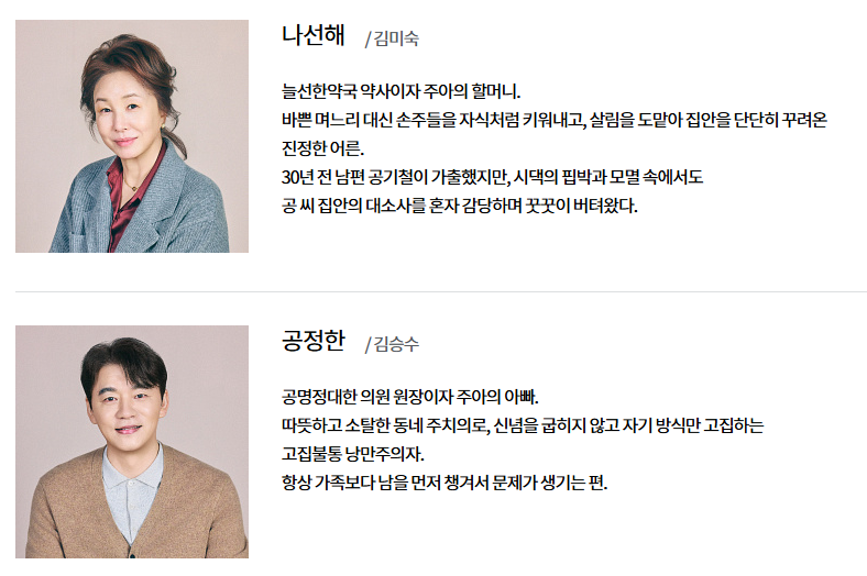 | 김미숙 | 나선해 | 공씨 집안 맏며느리. 약사 |
